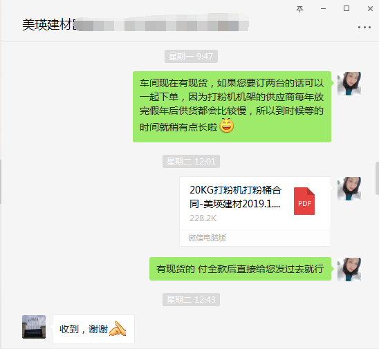 此次已經(jīng)是博昌建材粉末打粉機廠家第二次與美瑛合作,直接微信溝通確認(rèn)好有現(xiàn)貨就直接下訂單了!